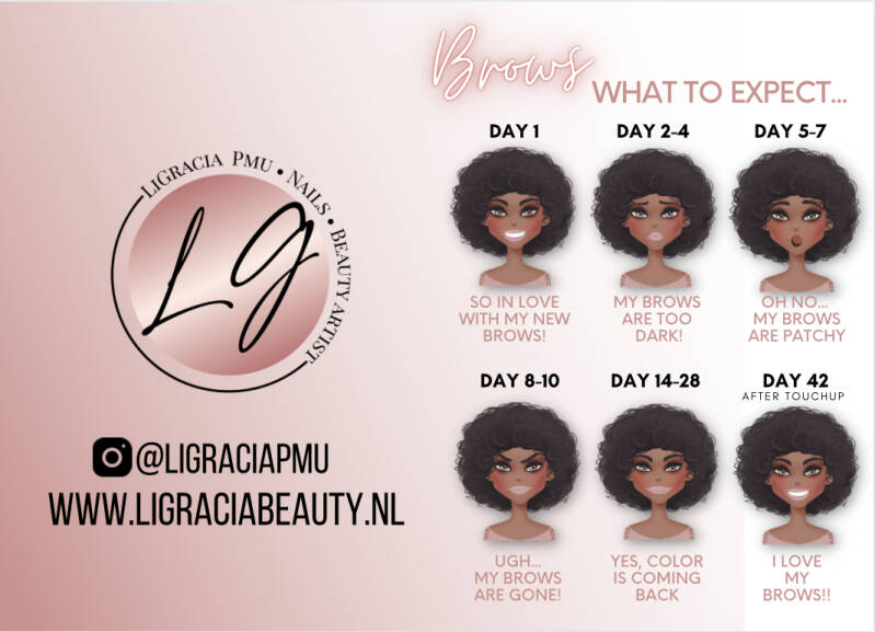- Tijdens de eerste twee weken na de behandeling kunnen de wenkbrauwen per dag verschillend uitzien. Geen paniek, dit hoort bij het proces!